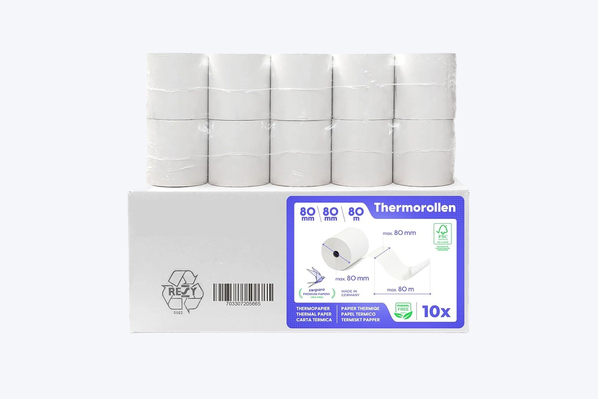 Rotoli di carta termica 80×80 mm di alta qualità, ideali per registratori di cassa, stampanti POS e dispositivi termici. Realizzati in carta termica BPA FREE, sensibile al calore e omologata per la stampa degli scontrini.