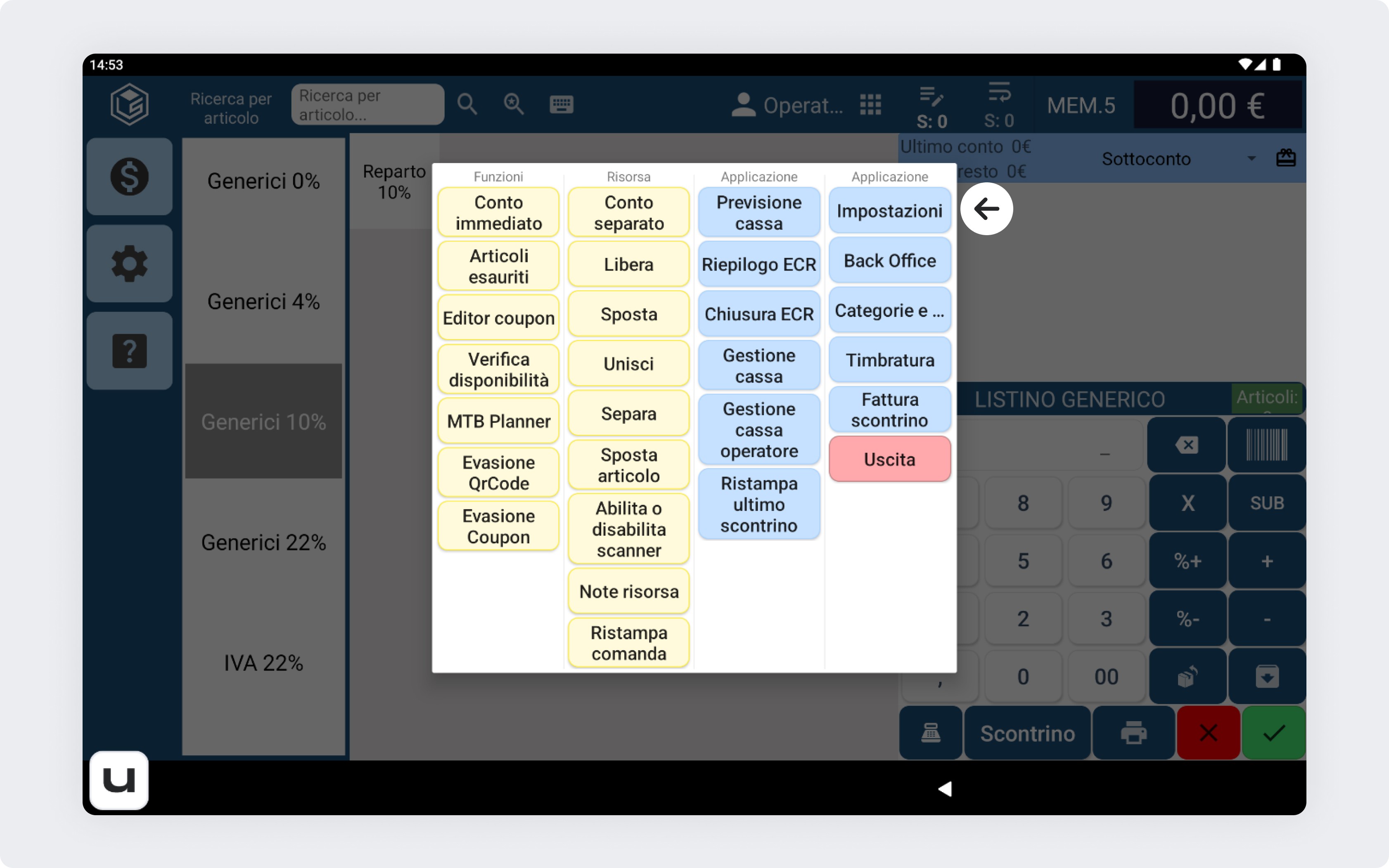 Dalla schermata principale della cassa, clicca sulla rotellina delle impostazioni sulla sinistra.