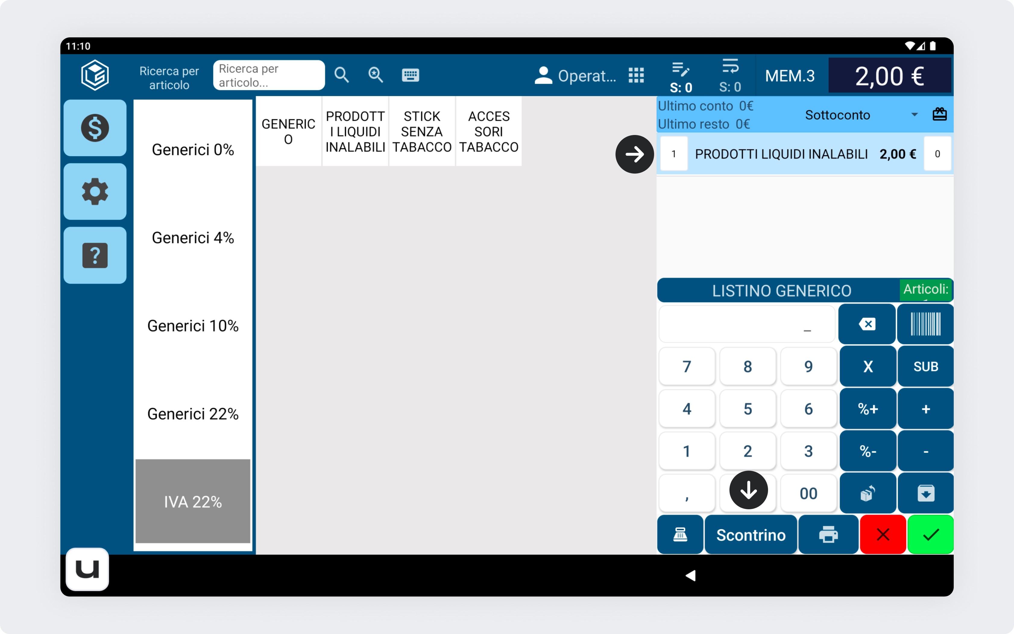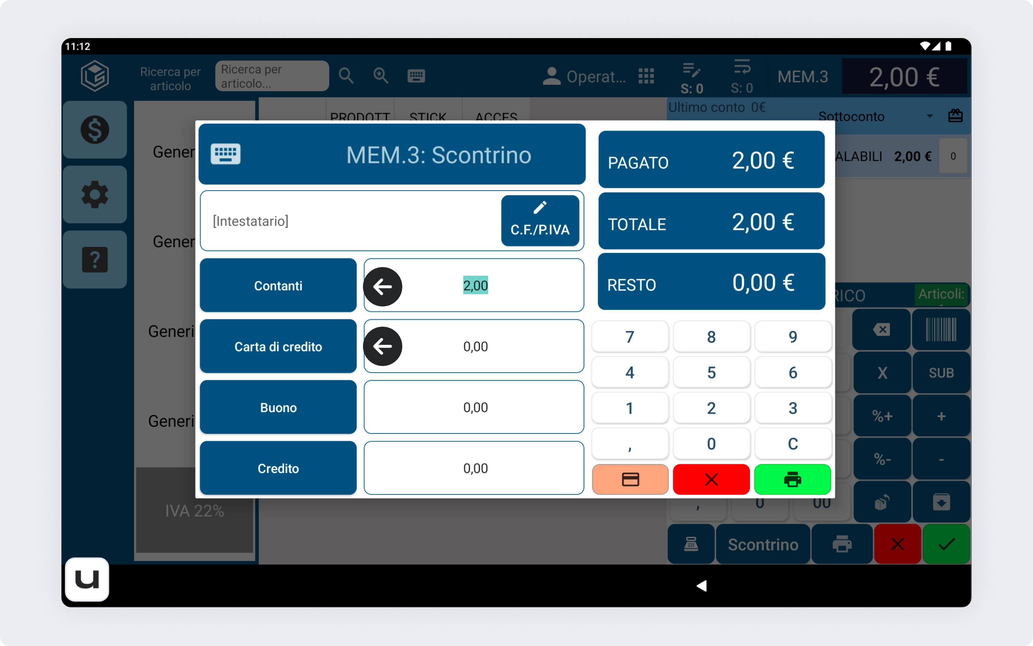 Dopo aver inserito gli articoli, premi il pulsante Scontrino nella parte inferiore della schermata per accedere alla fase di pagamento.