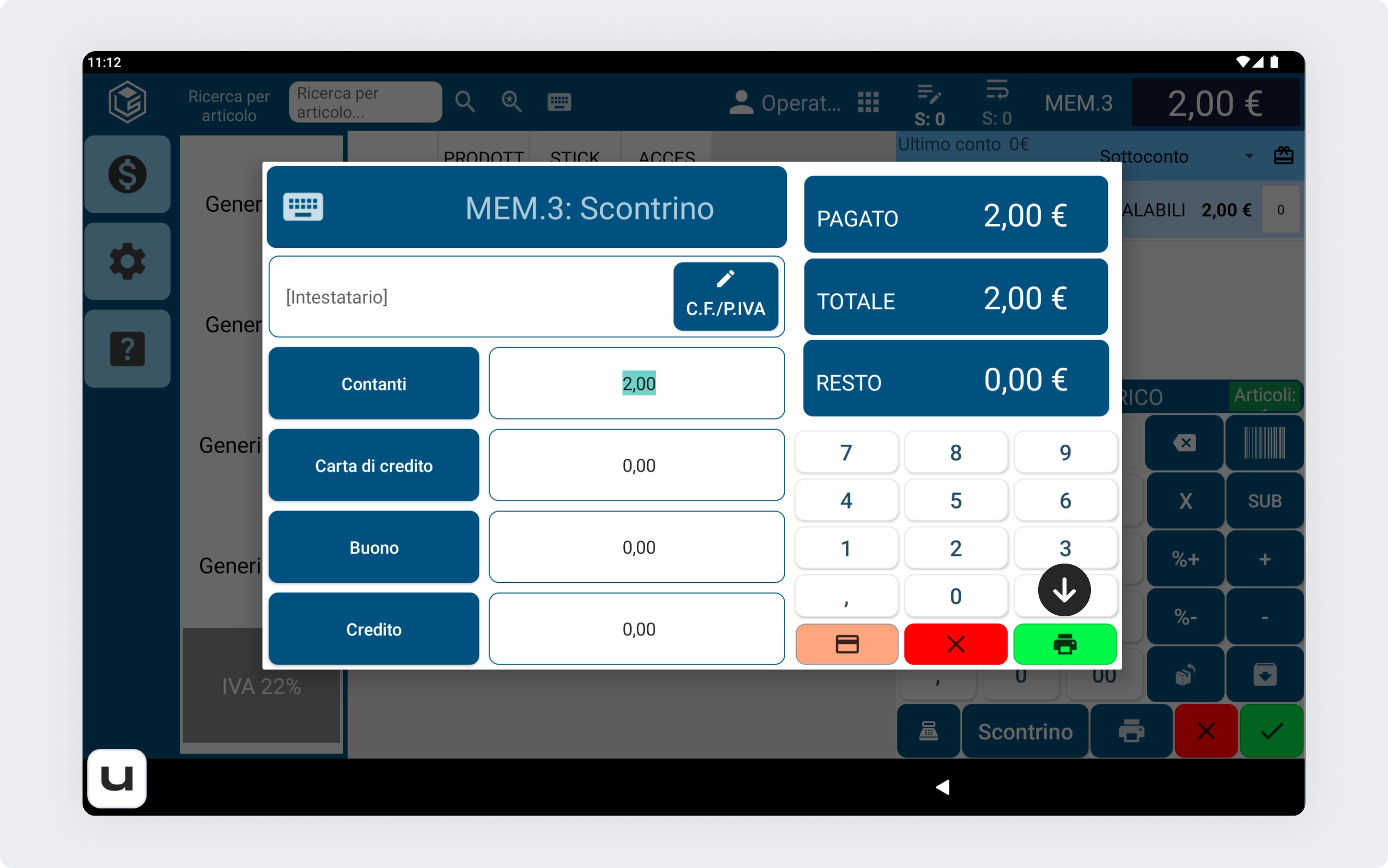 premi l’icona verde della stampante in basso a destra per stampare lo scontrino