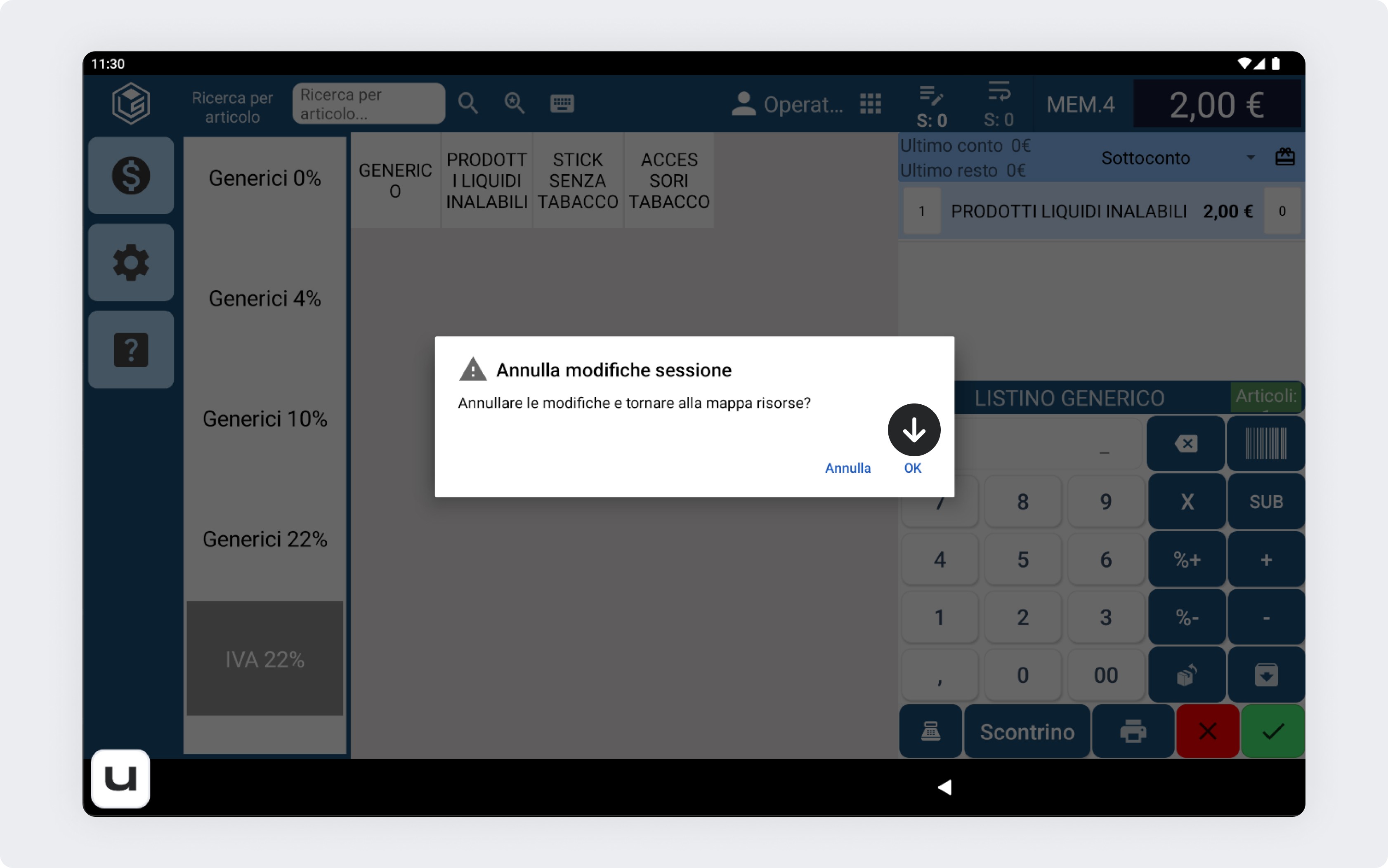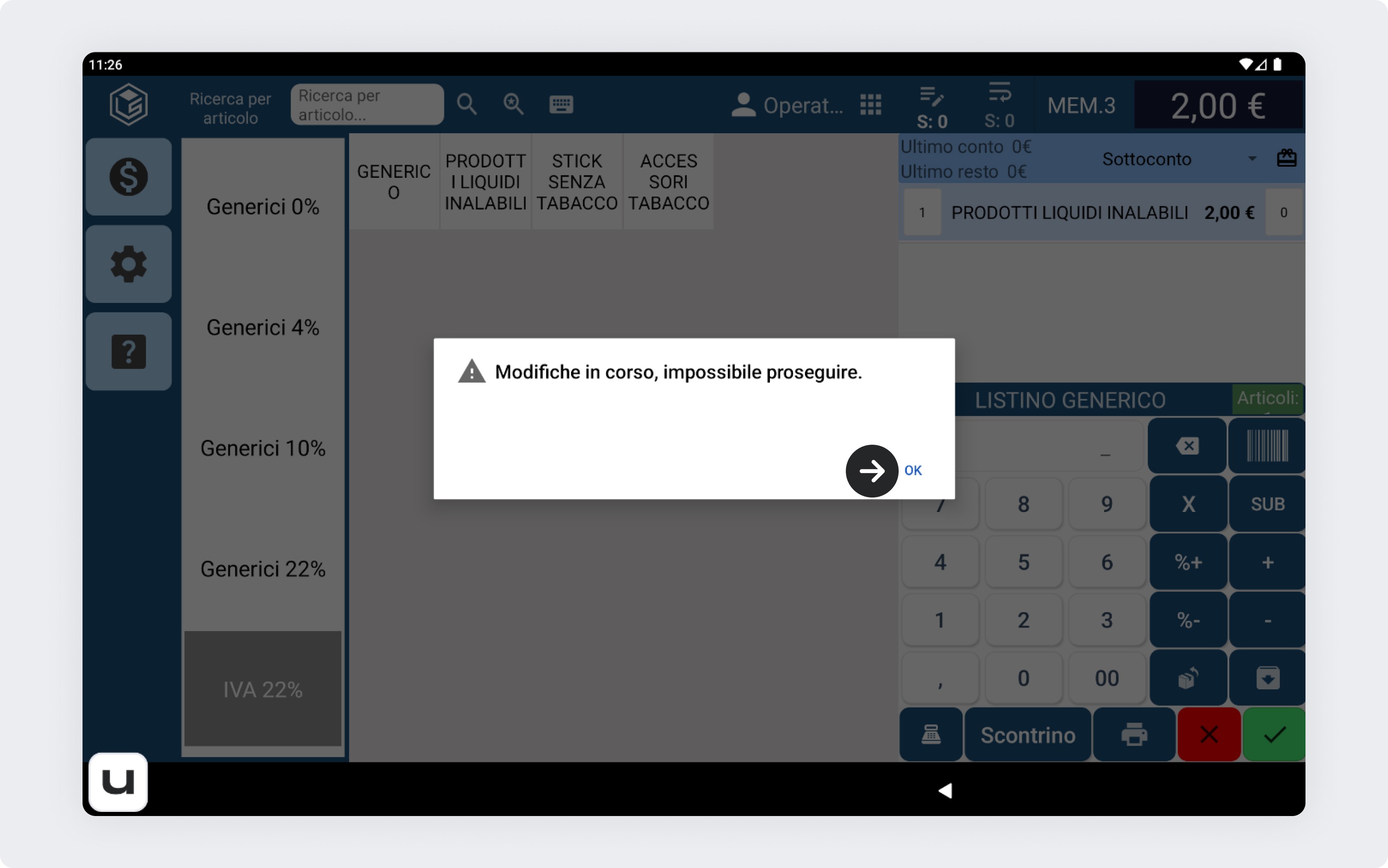 Quando sulla cassa appare il messaggio “Modifiche in corso, impossibile proseguire”, significa che è presente un conto ancora aperto e la cassa non consente modifiche dal backoffice fino a quando il conto non viene chiuso.