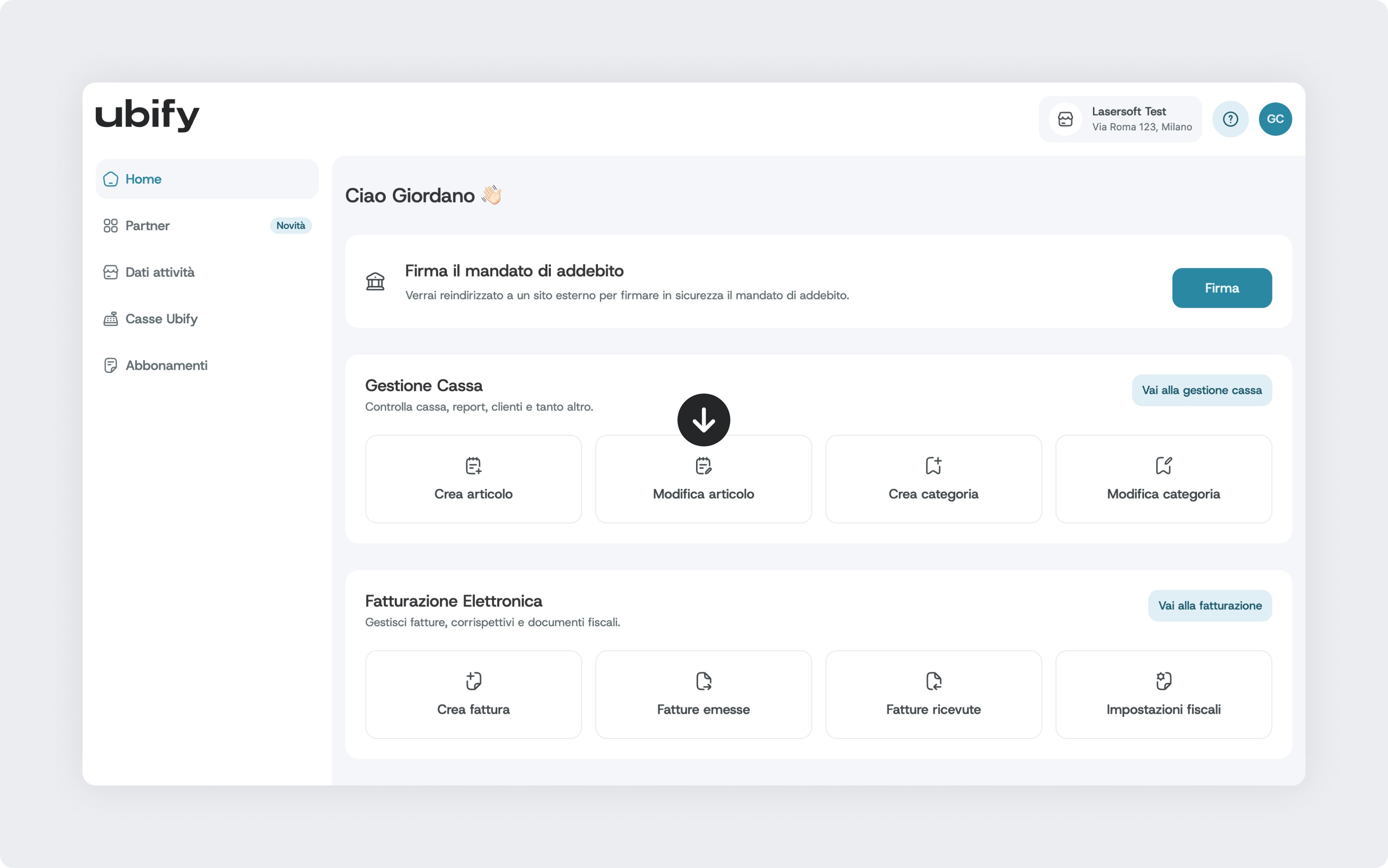 Dalla home del portale Ubify, individua la sezione Gestione cassa.